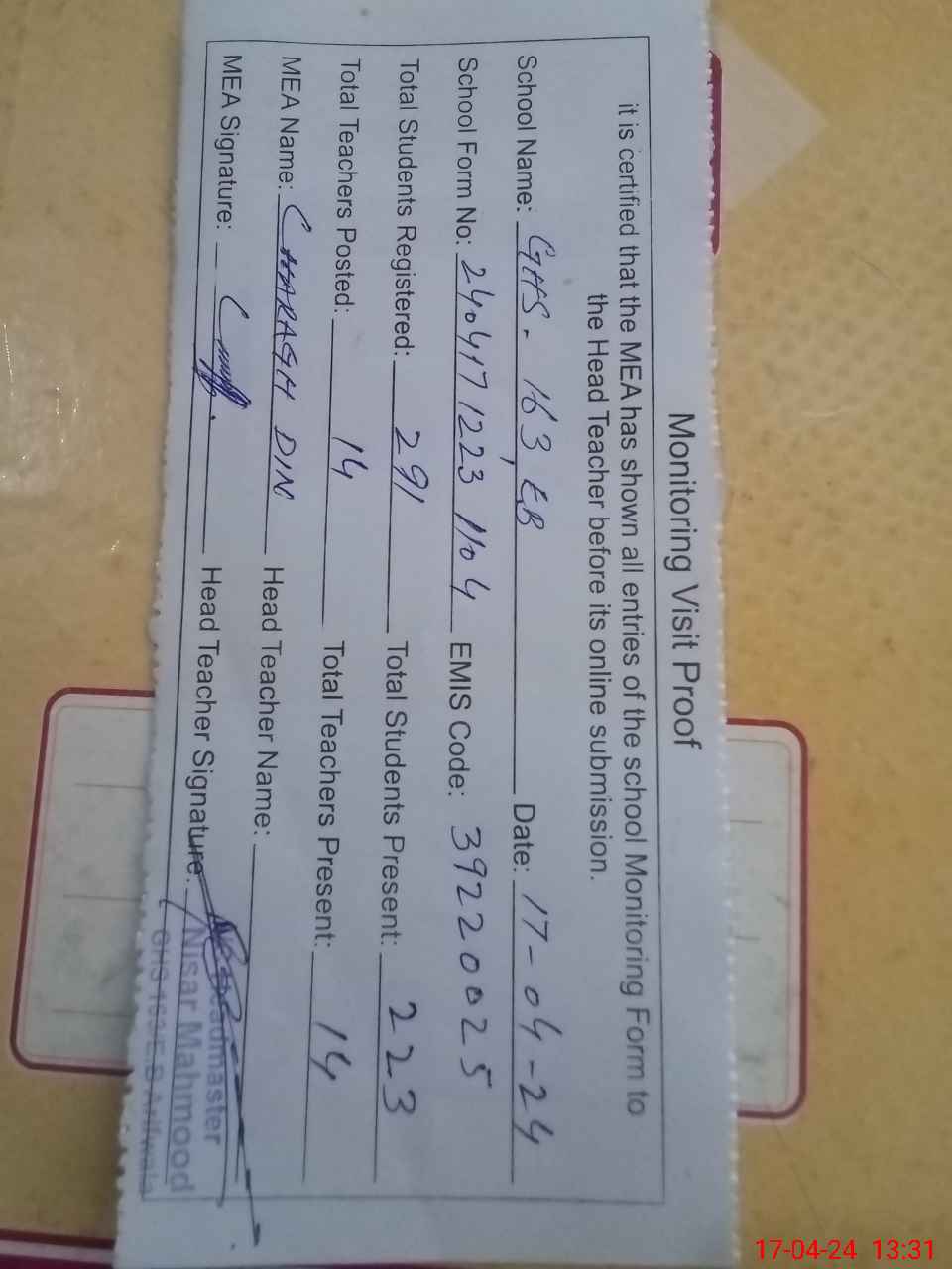 | EMIS Code: 39220025 | Name of School: GHS 163/EB | |||