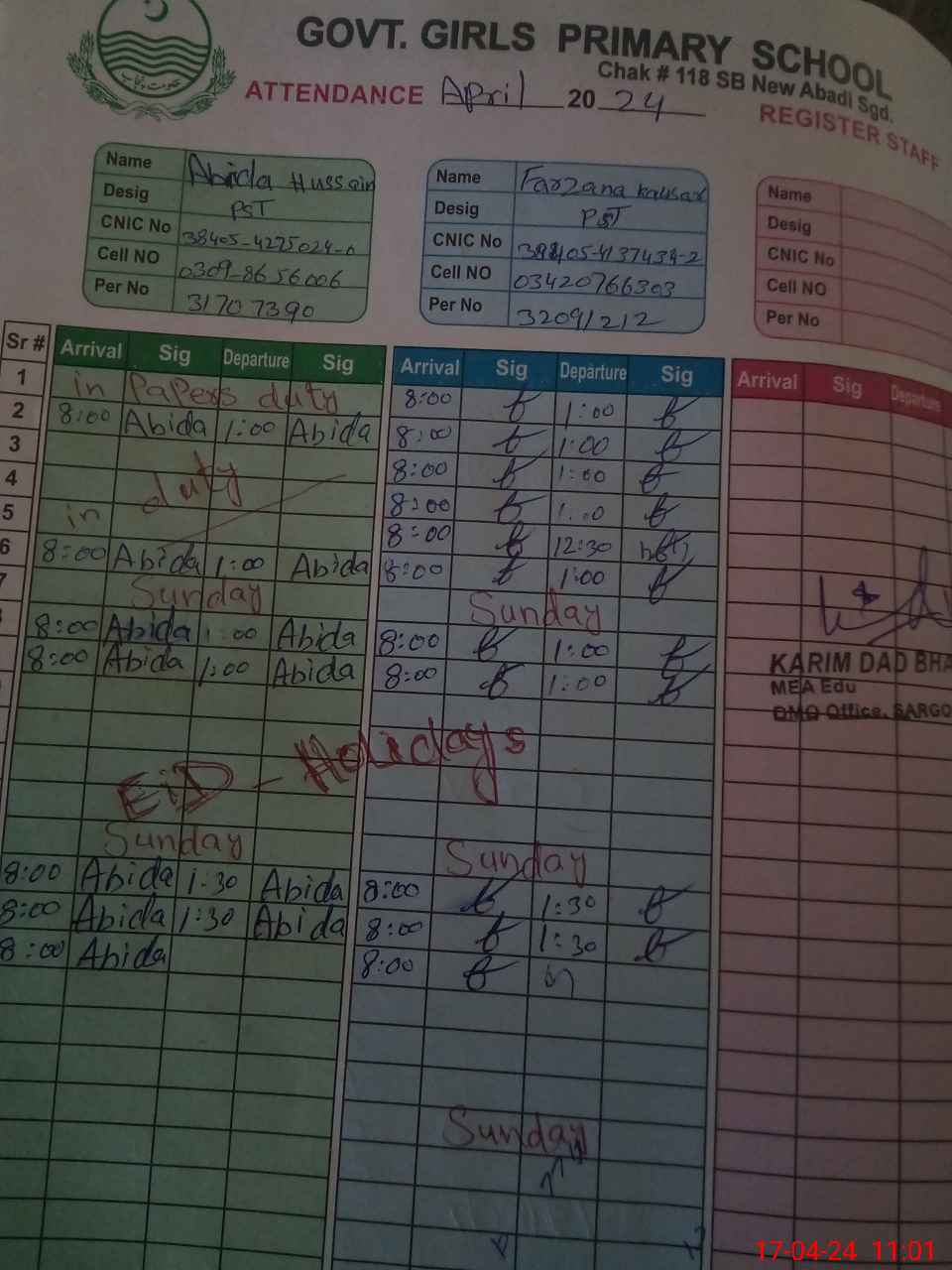 | CNIC | Full Name | Designation | R/C | Absence During Last Calender Month |