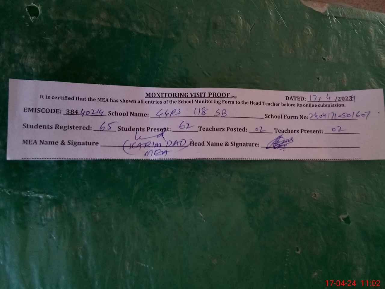 | Attendance Register | Head Teacher | MEA with School | Visit Proof |