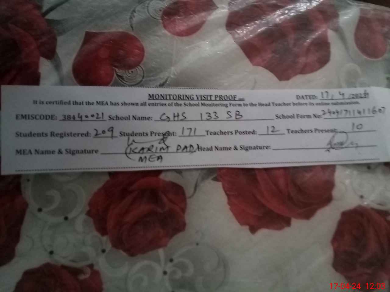 | EMIS Code: 38440021 | Name of School: GHS CHAK NO 133 SB | |||