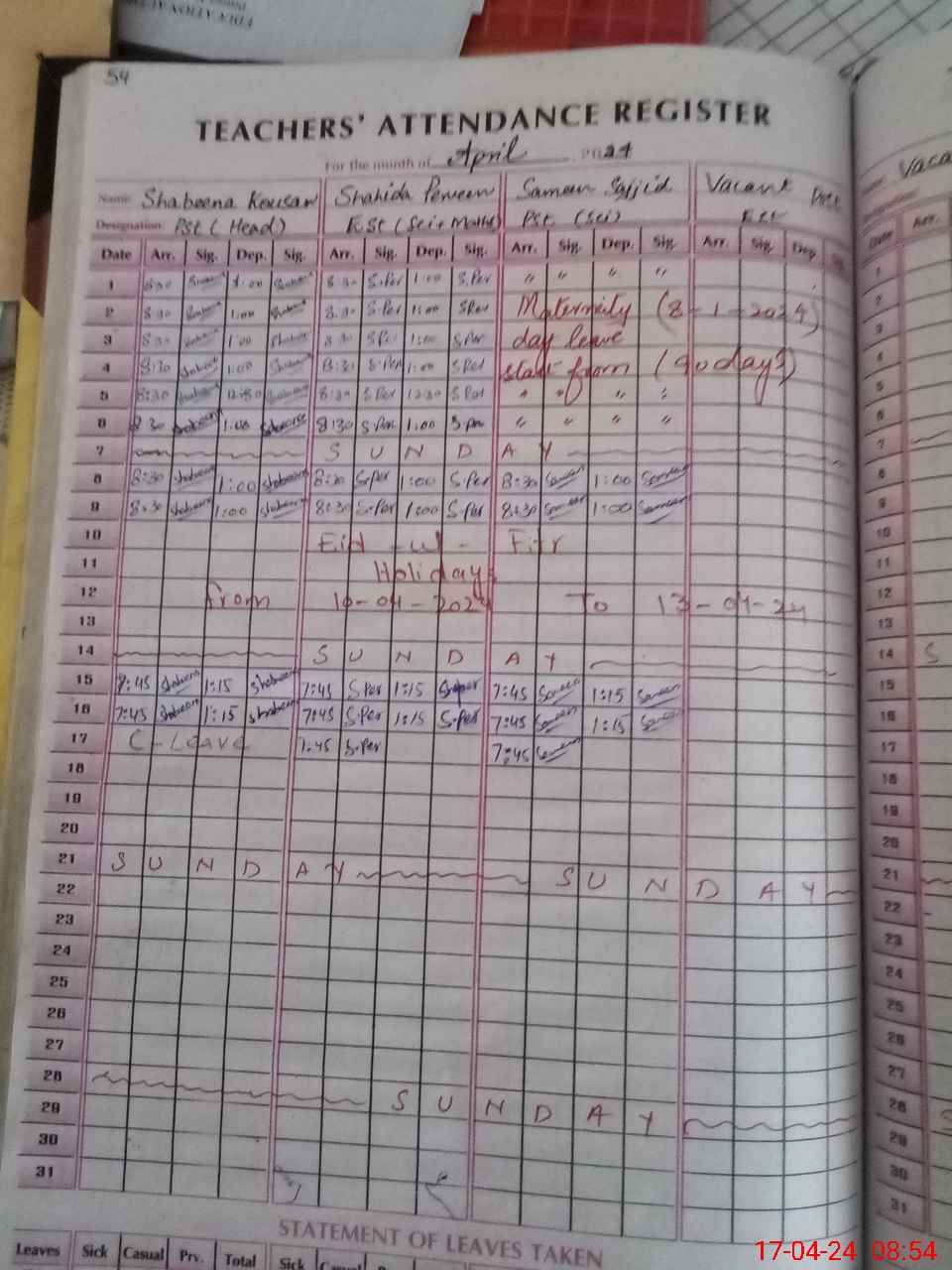 | Leave | Duty | Absent | Maternity | Medical | Ex- Pak |