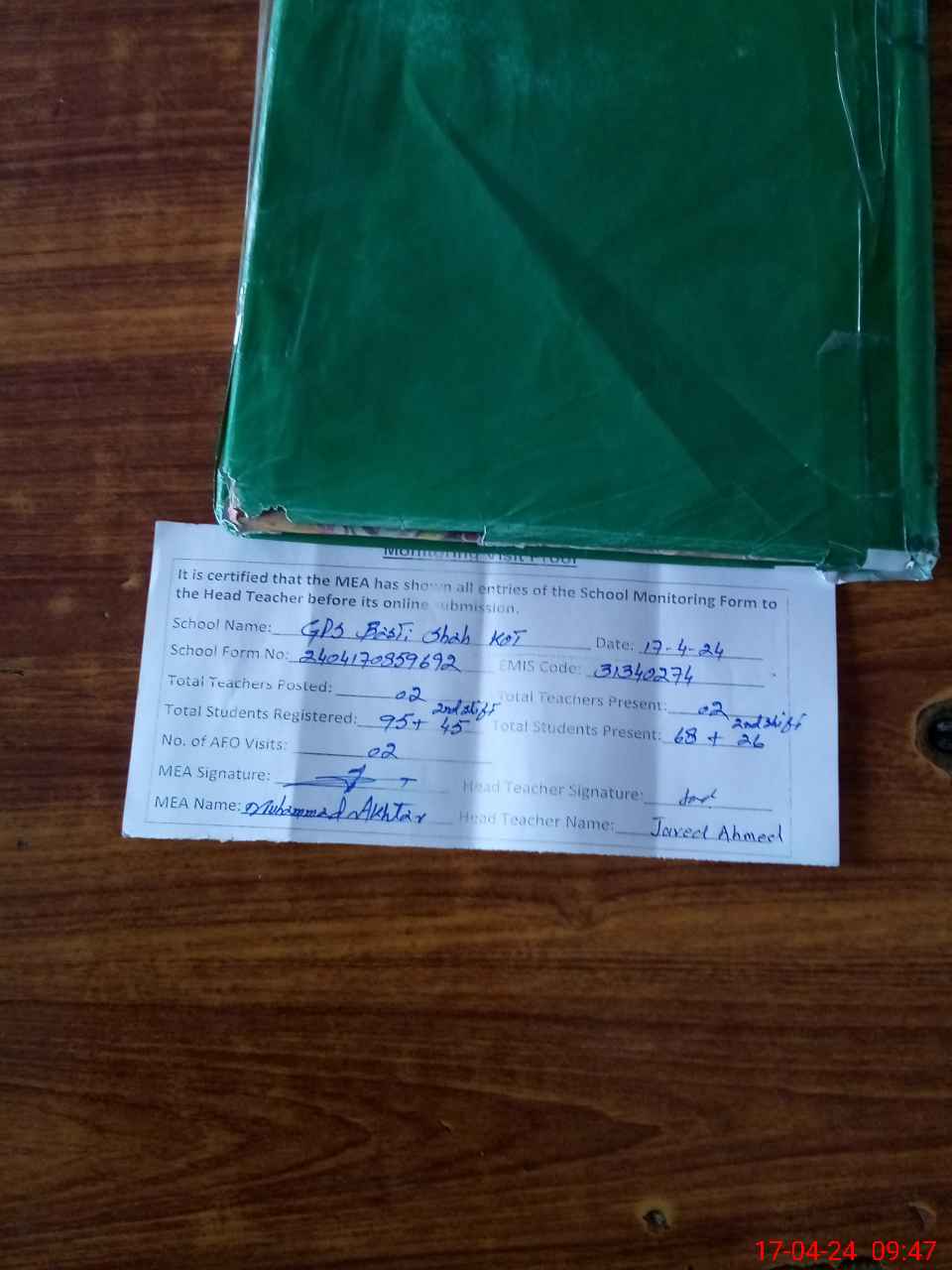 | Attendance Register | Head Teacher | MEA with School | Visit Proof |