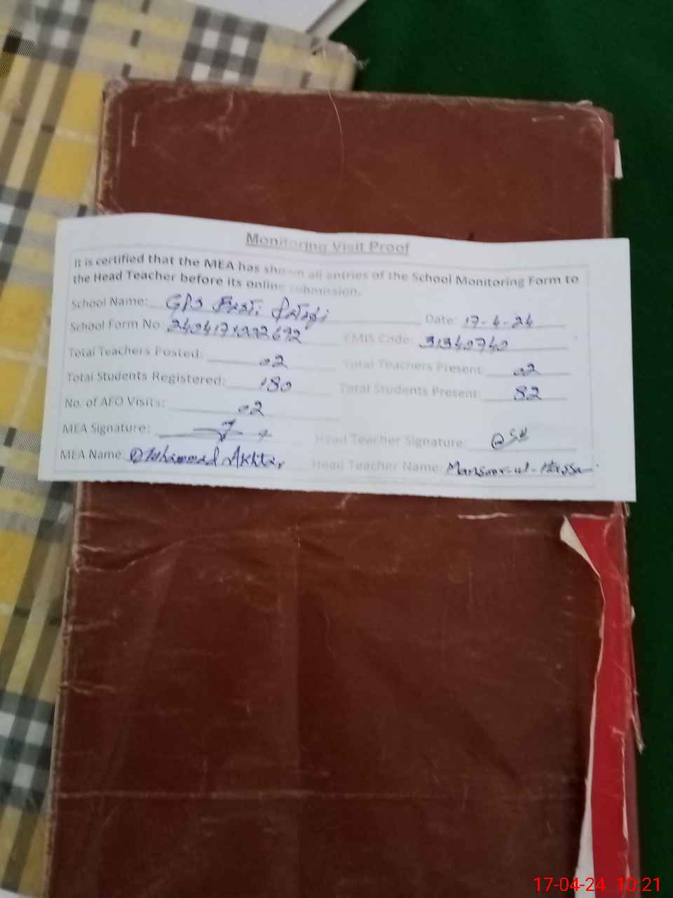 | Attendance Register | Head Teacher | MEA with School | Visit Proof |
