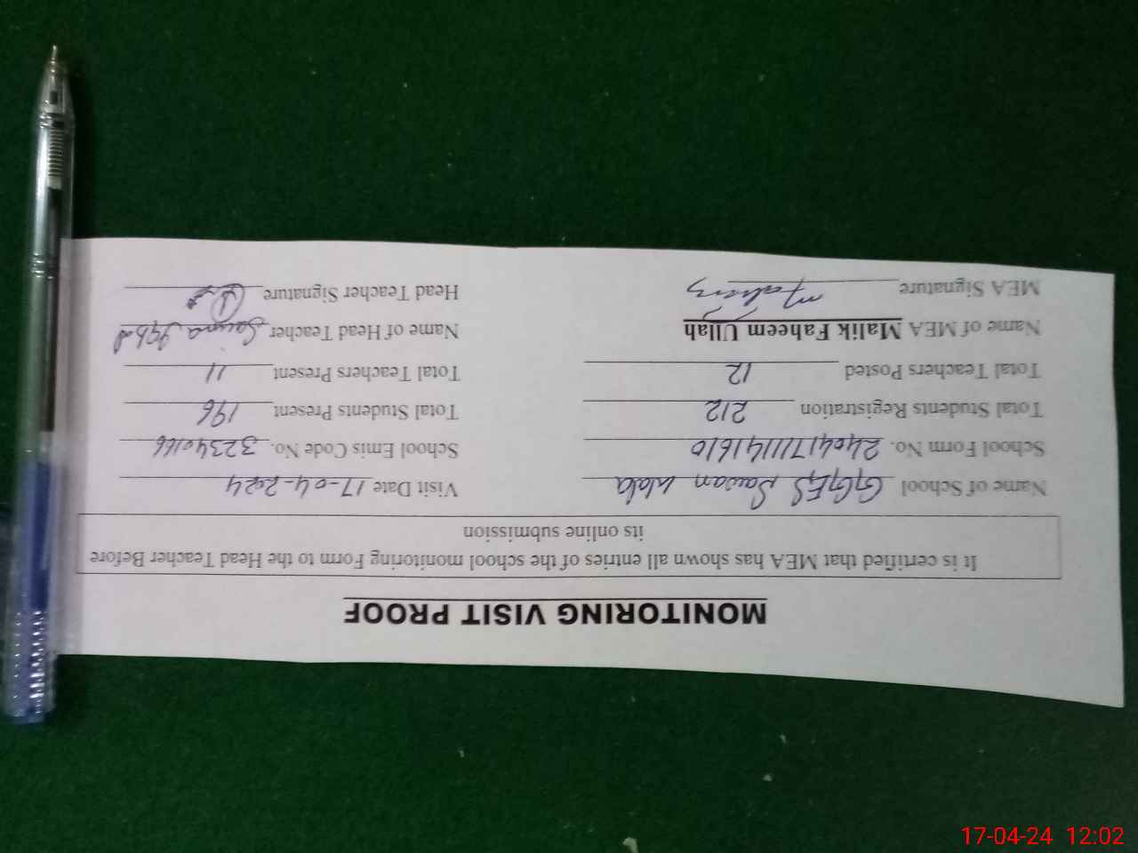 | Attendance Register | Head Teacher | MEA with School | Visit Proof |