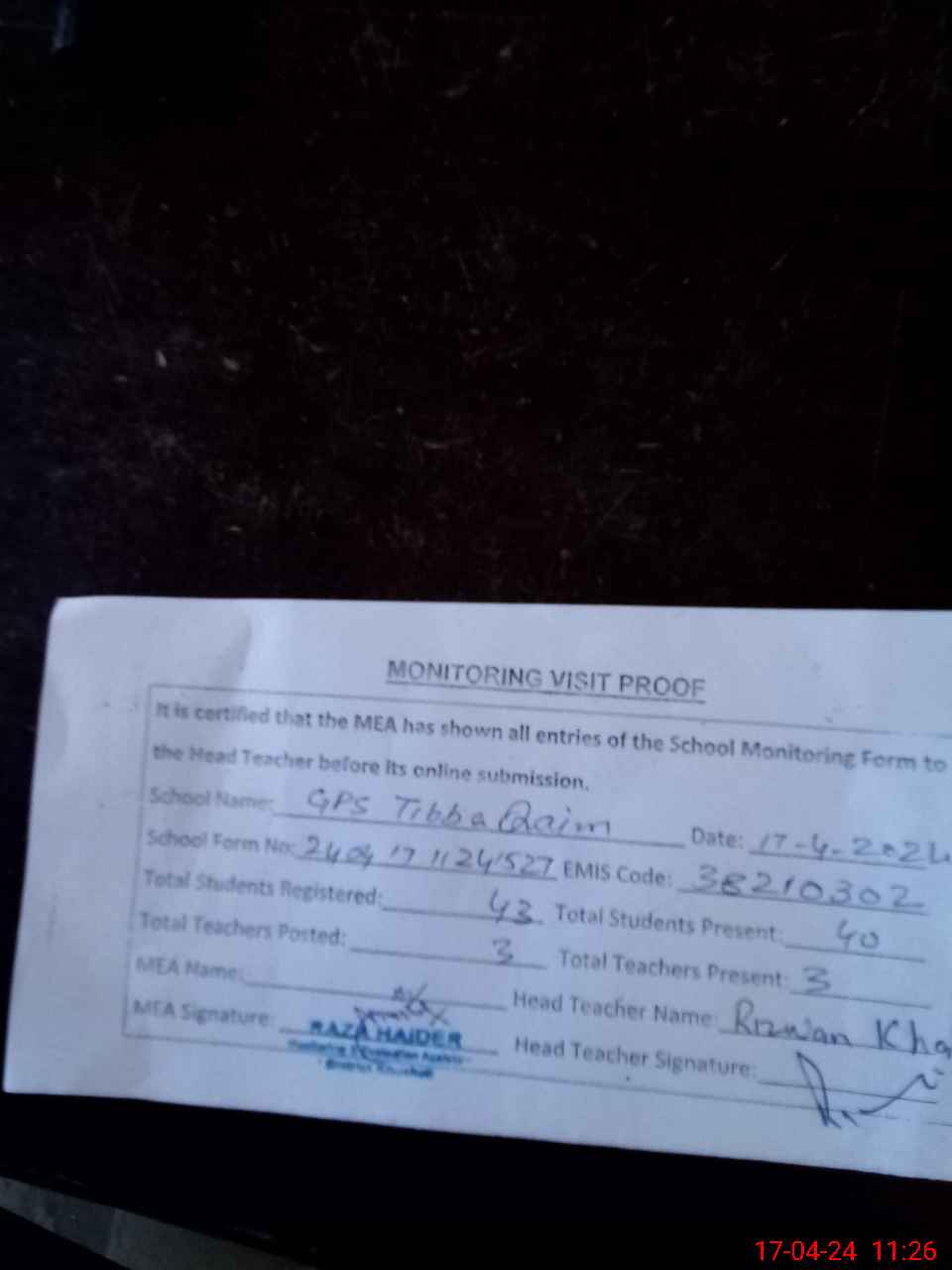| Name: RI**** KH**** Designation: (School Headmaster's/Headmistress's) pst Phone/Cell Number: 03**** |
