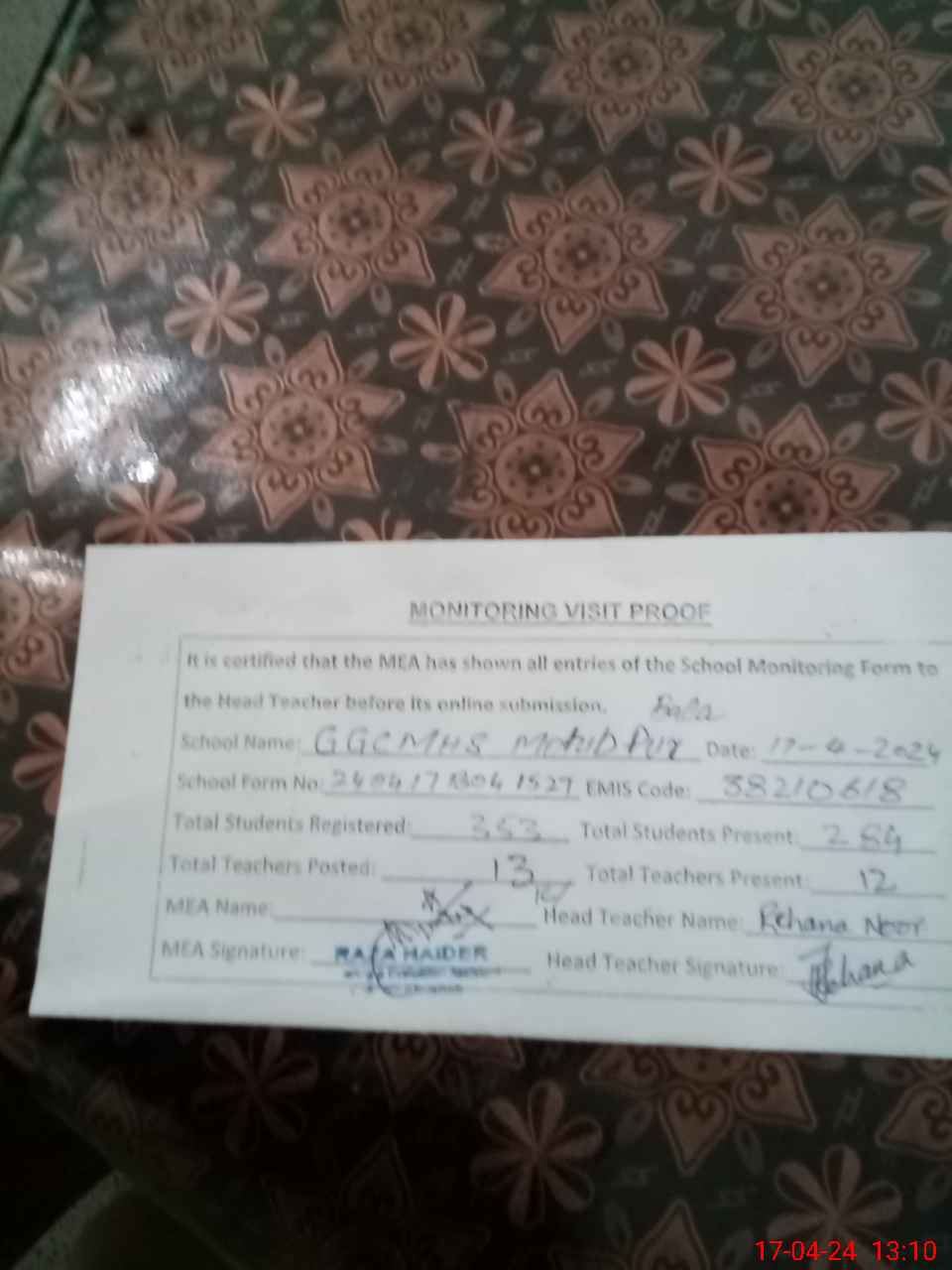 | Attendance Register | Head Teacher | MEA with School | Visit Proof |