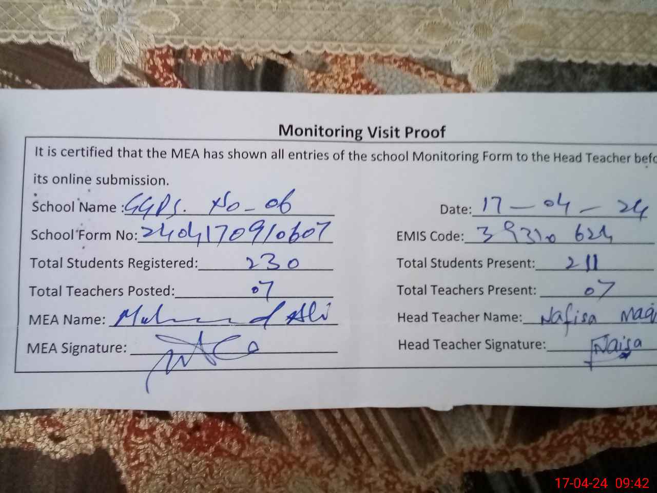 | Attendance Register | Head Teacher | MEA with School | Visit Proof |