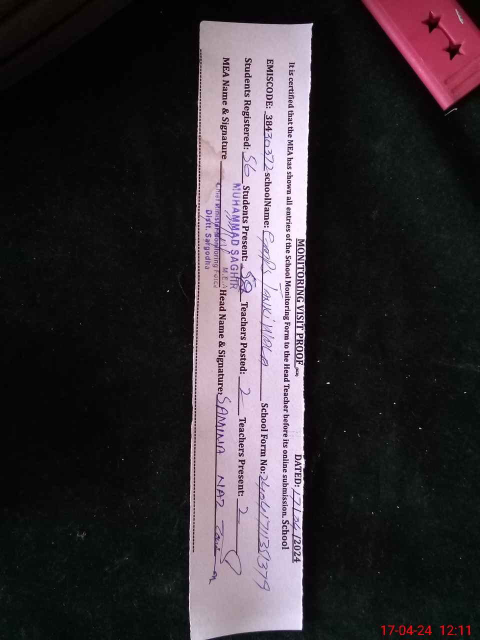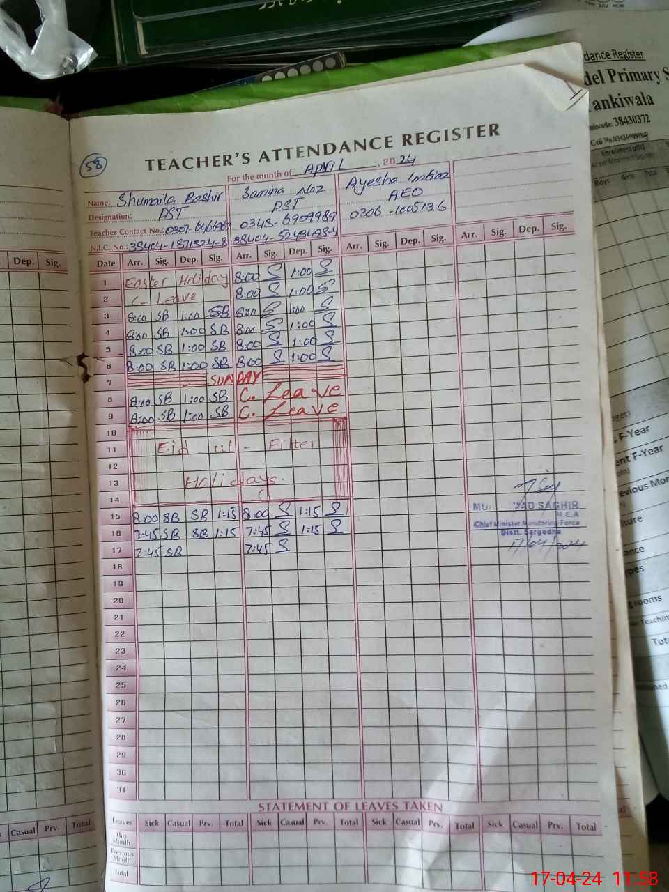 | Name: SA**** NA**** Designation: (School Headmaster's/Headmistress's) PST Phone/Cell Number: 03**** |