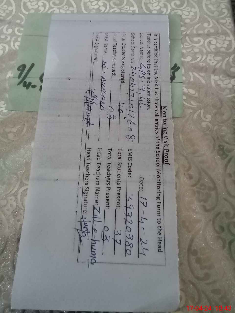 | Attendance Register | Head Teacher | MEA with School | Visit Proof |