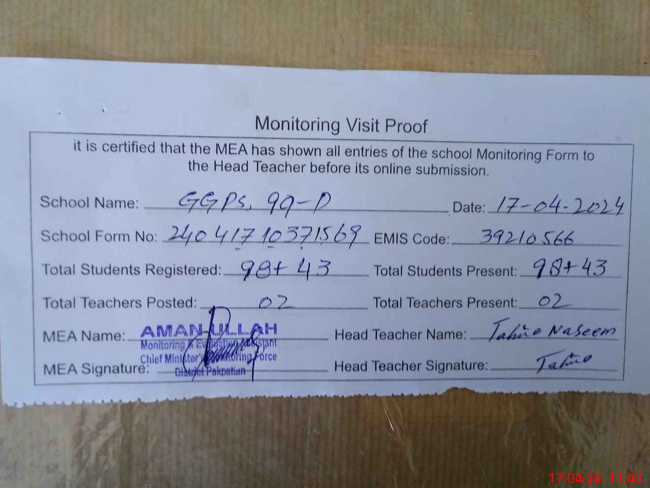 | EMIS Code: 39210566 | Name of School: GGPS 99/D | |||