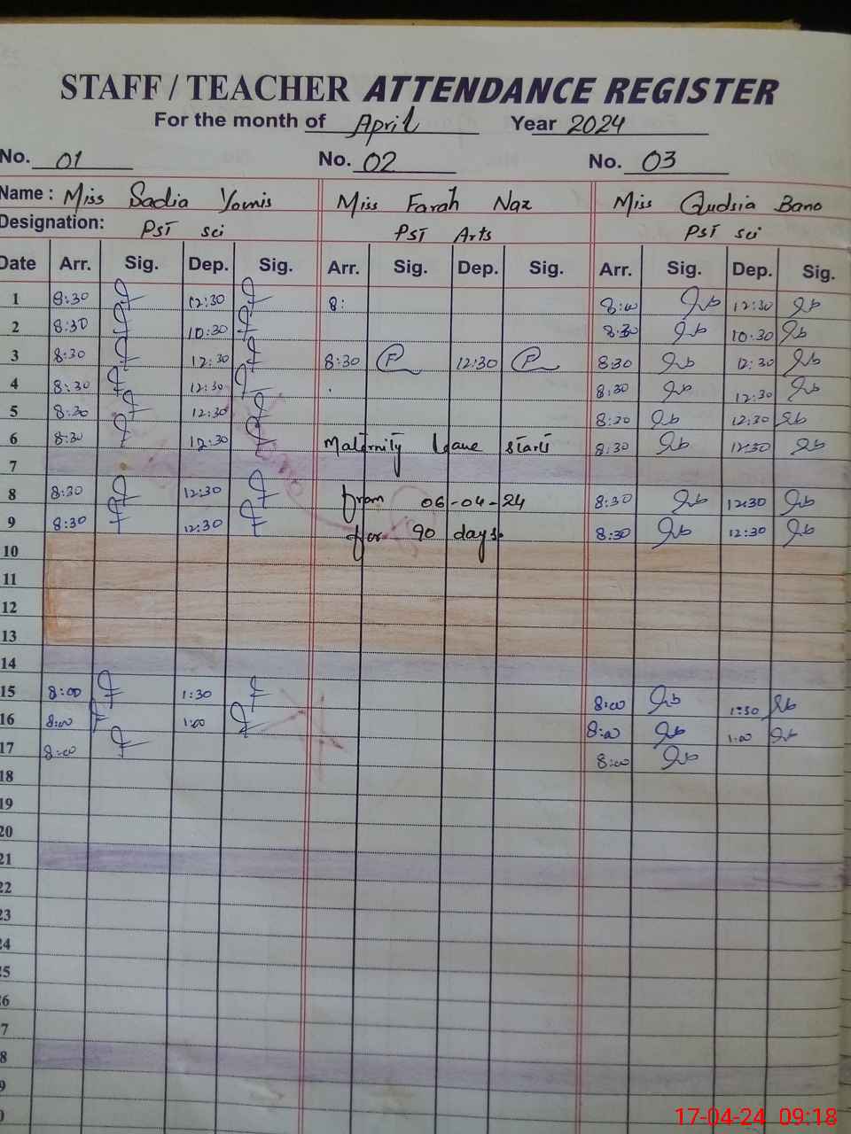 | 37**** | Fa**** Na**** | PST | Regular | 0 | 0 | 0 | 0 | 0 | 0 | 0 | 0 | 0 | Maternity |