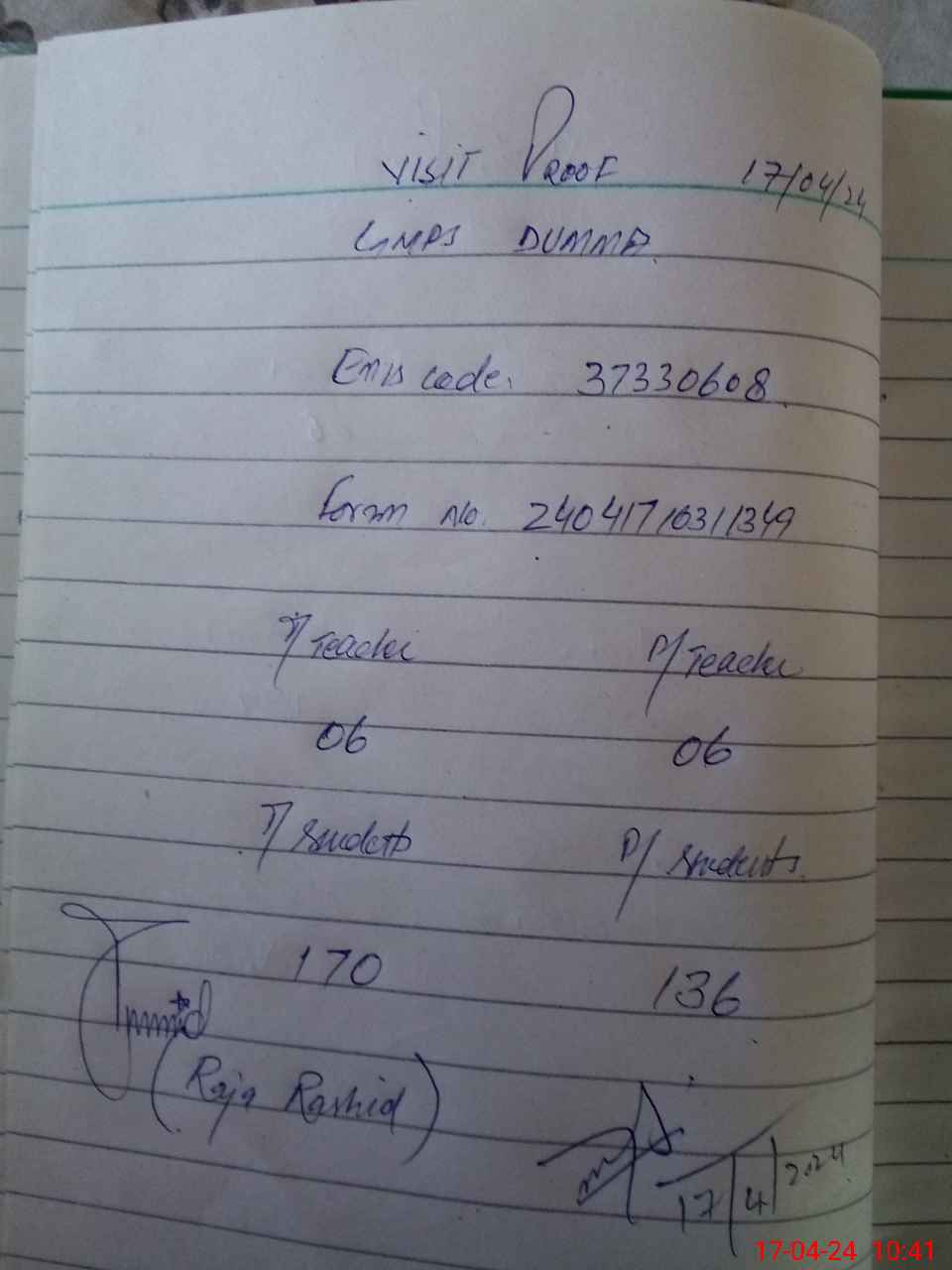 | Attendance Register | Head Teacher | MEA with School | Visit Proof |