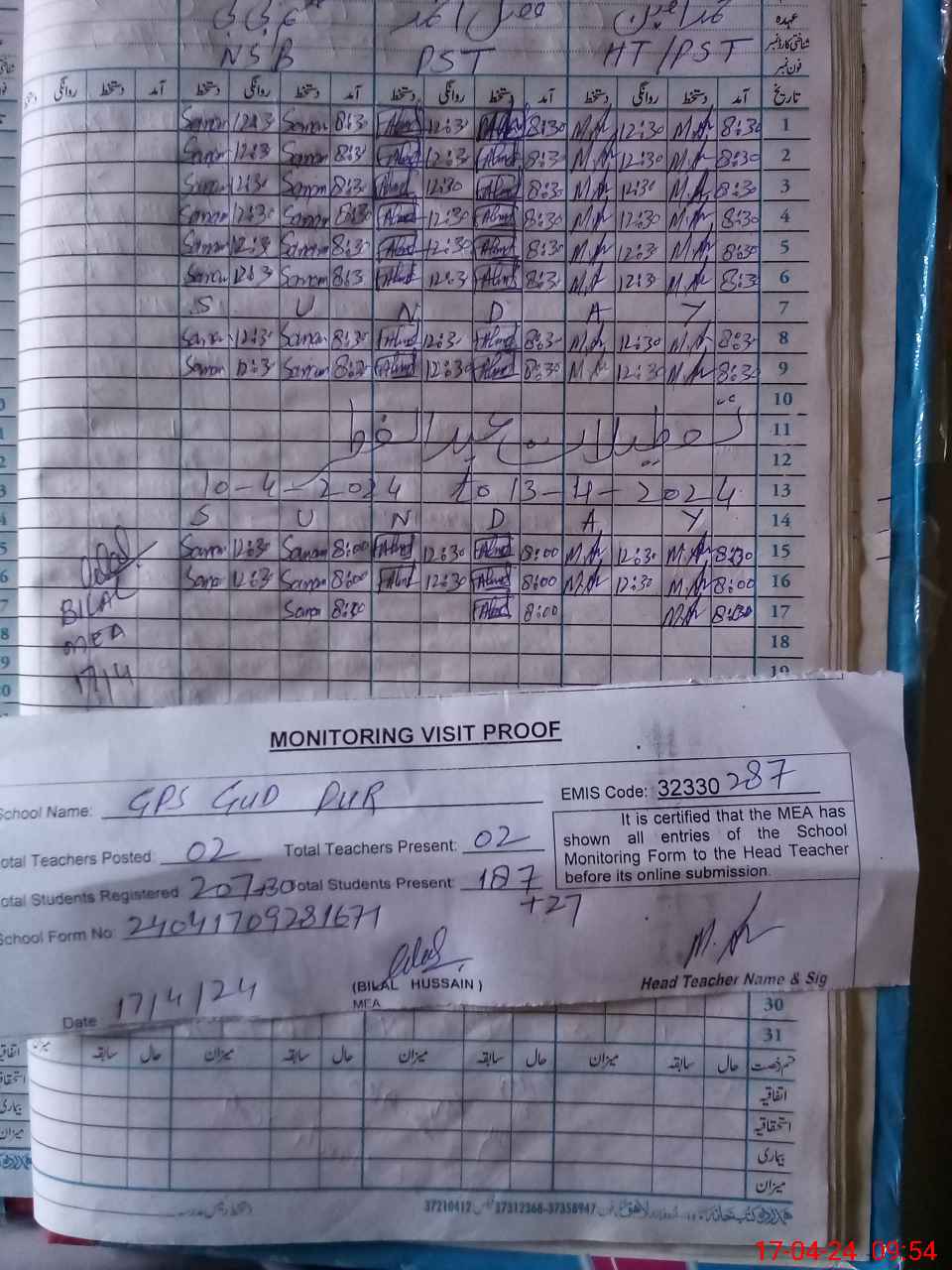 | Attendance Register | Head Teacher | MEA with School | Visit Proof |