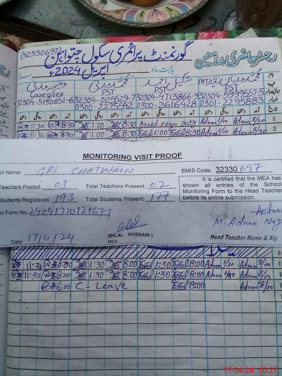 | Attendance Register | Head Teacher | MEA with School | Visit Proof |