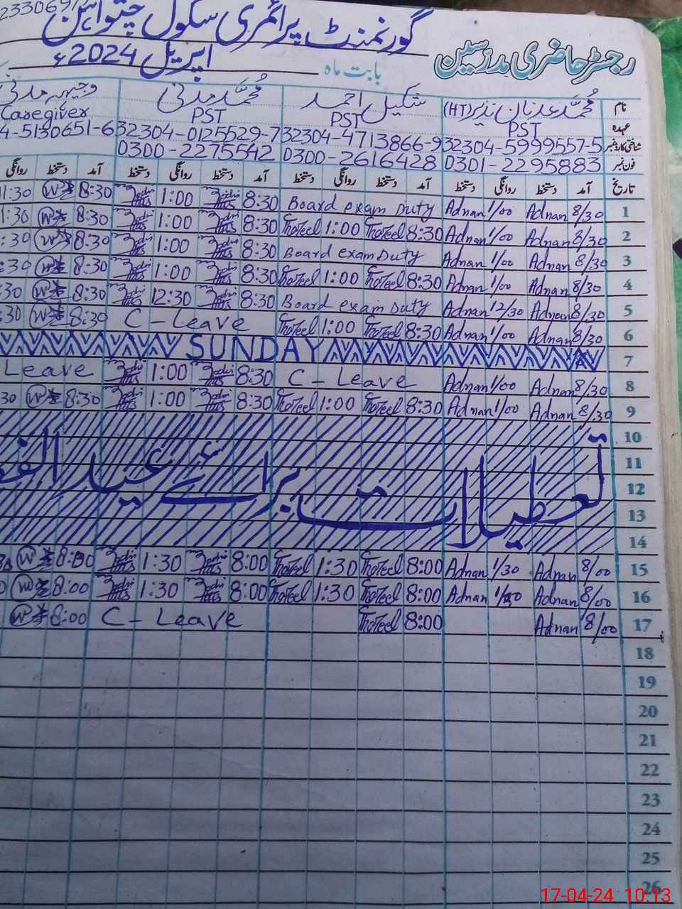 | CNIC | Full Name | Designation | R/C | Absence During Last Calender Month |