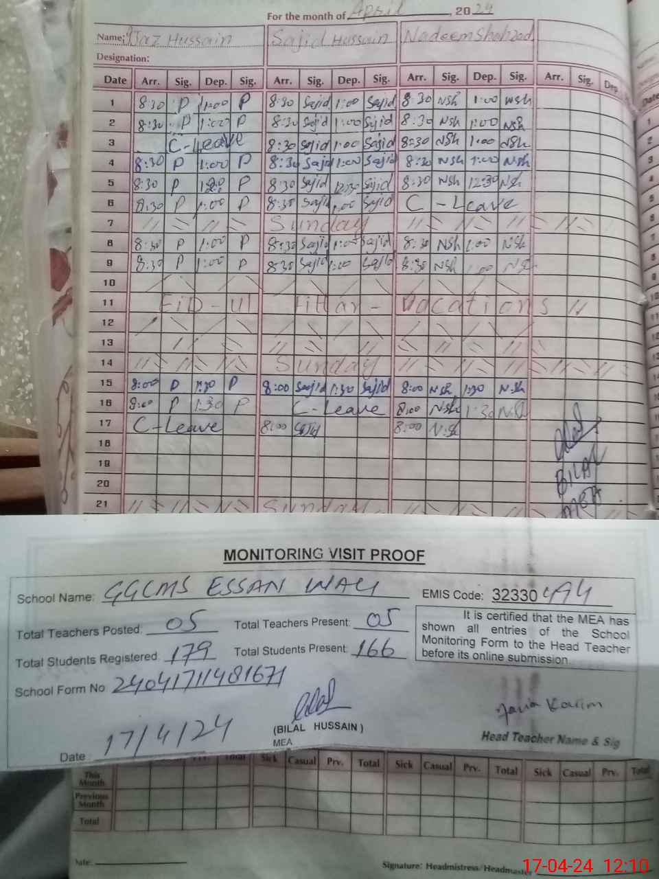 | Attendance Register | Head Teacher | MEA with School | Visit Proof |