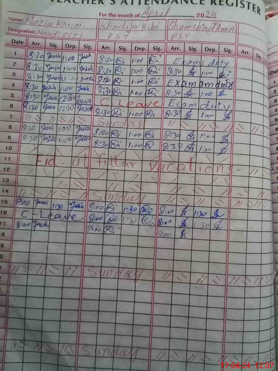 | CNIC | Full Name | Designation | R/C | Absence During Last Calender Month |