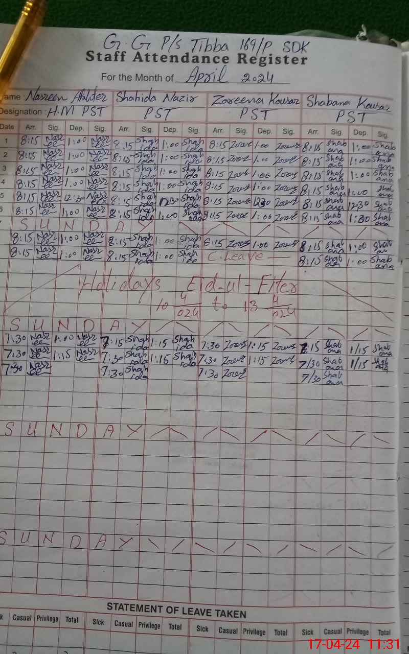 | CNIC | Full Name | Designation | R/C | Absence During Last Calender Month |