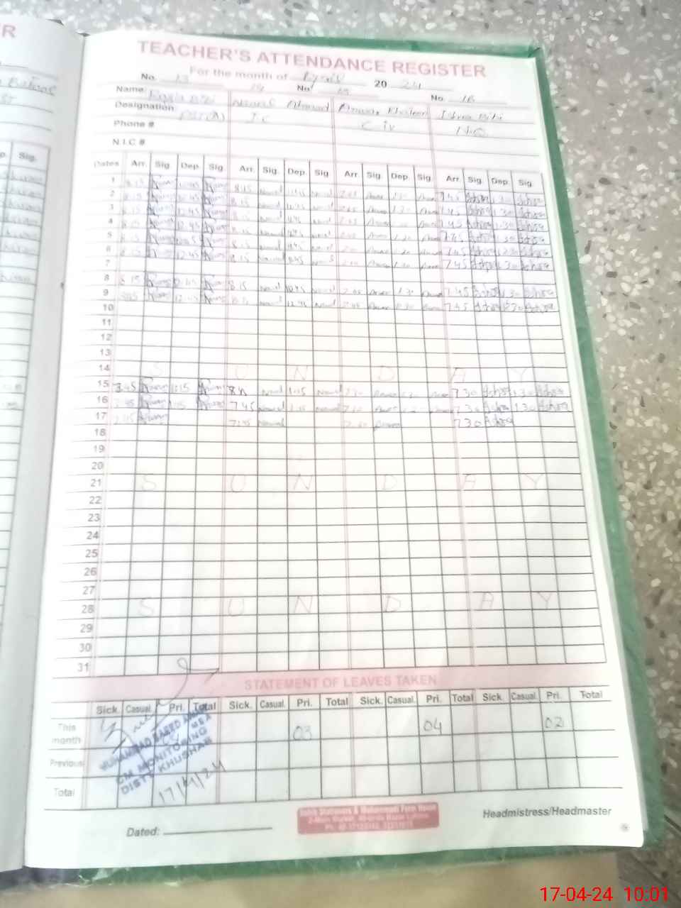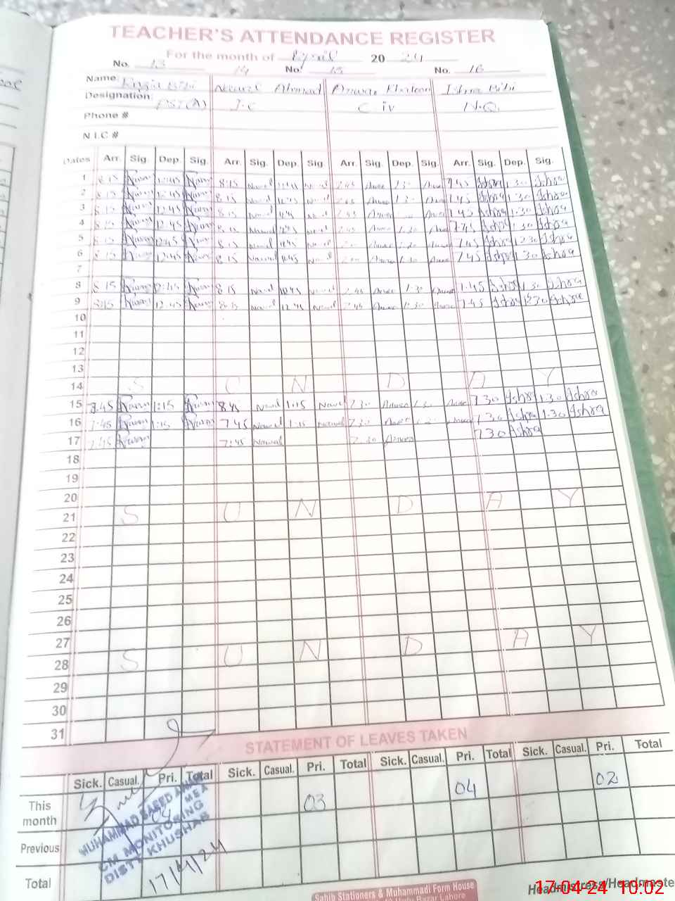 | CNIC | Full Name | Designation | R/C | Absence During Last Calender Month |