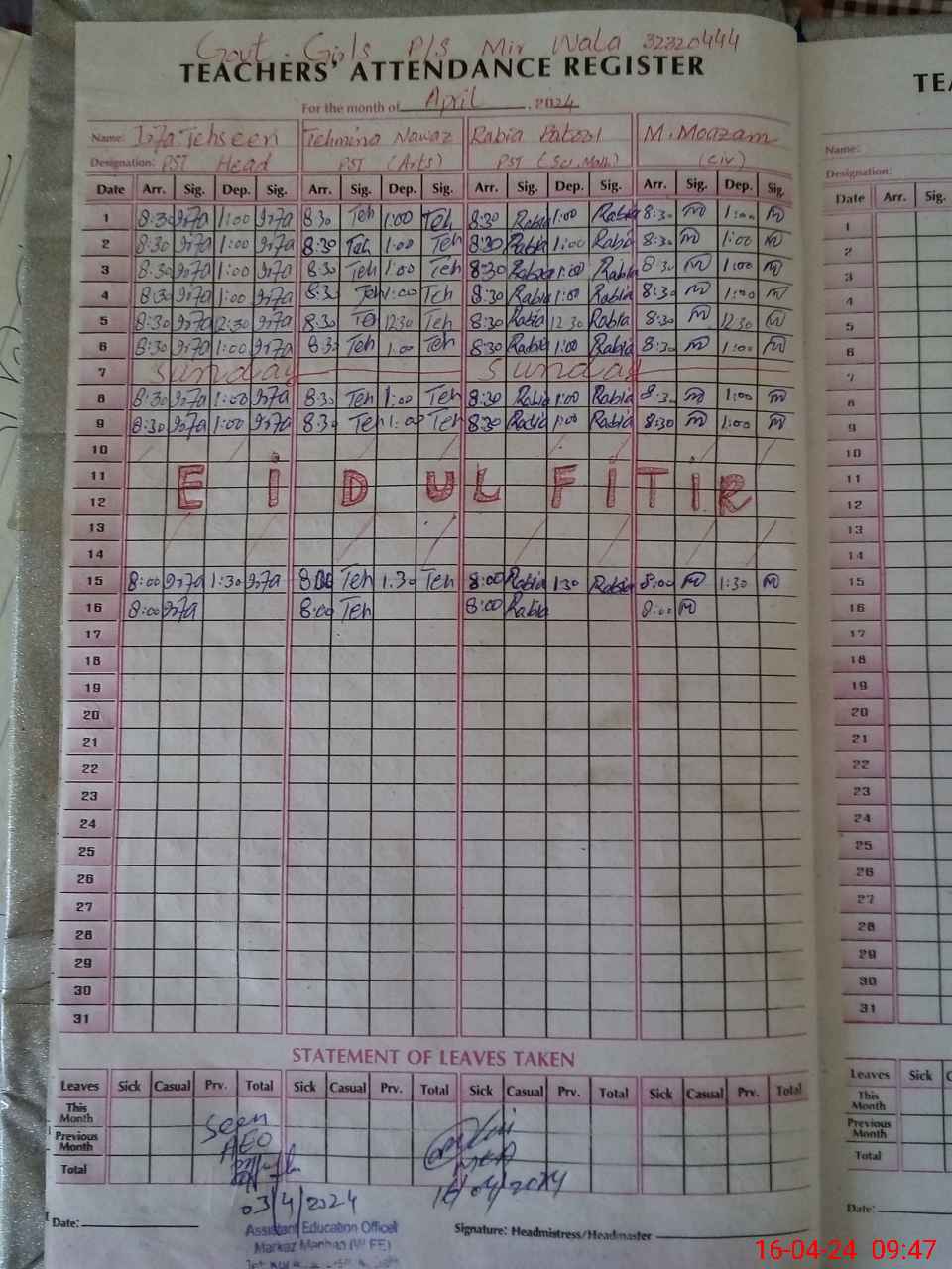 | Name: Ir**** Te**** Designation: (School Headmaster's/Headmistress's) PST Phone/Cell Number: 03**** |