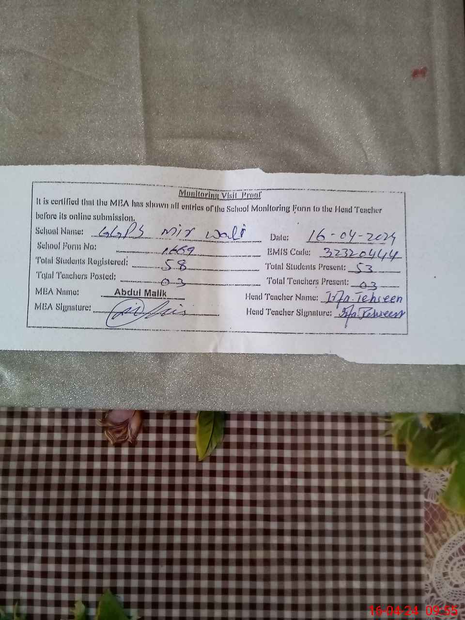 | Attendance Register | Head Teacher | MEA with School | Visit Proof |