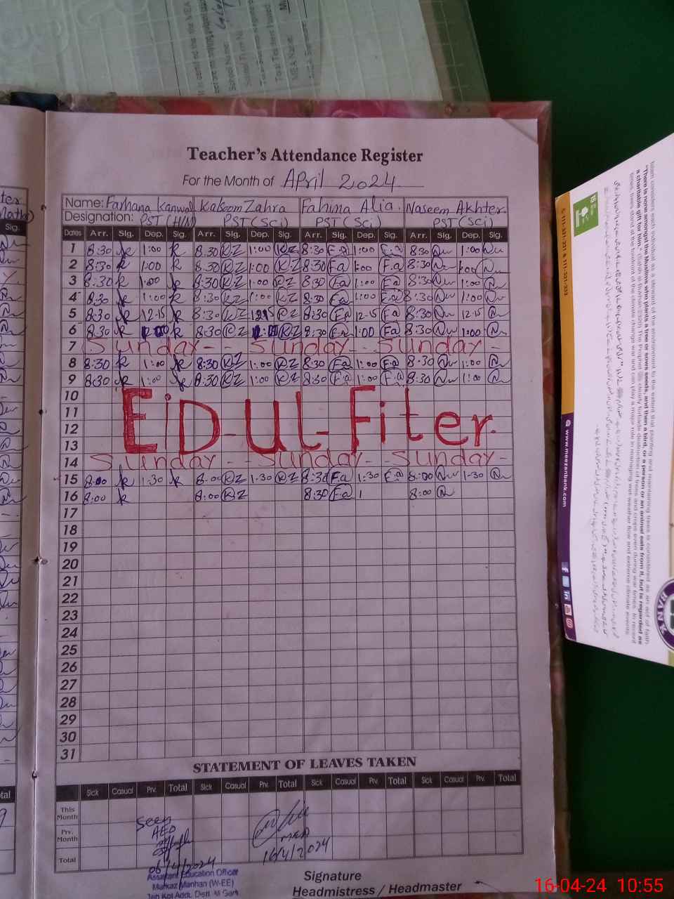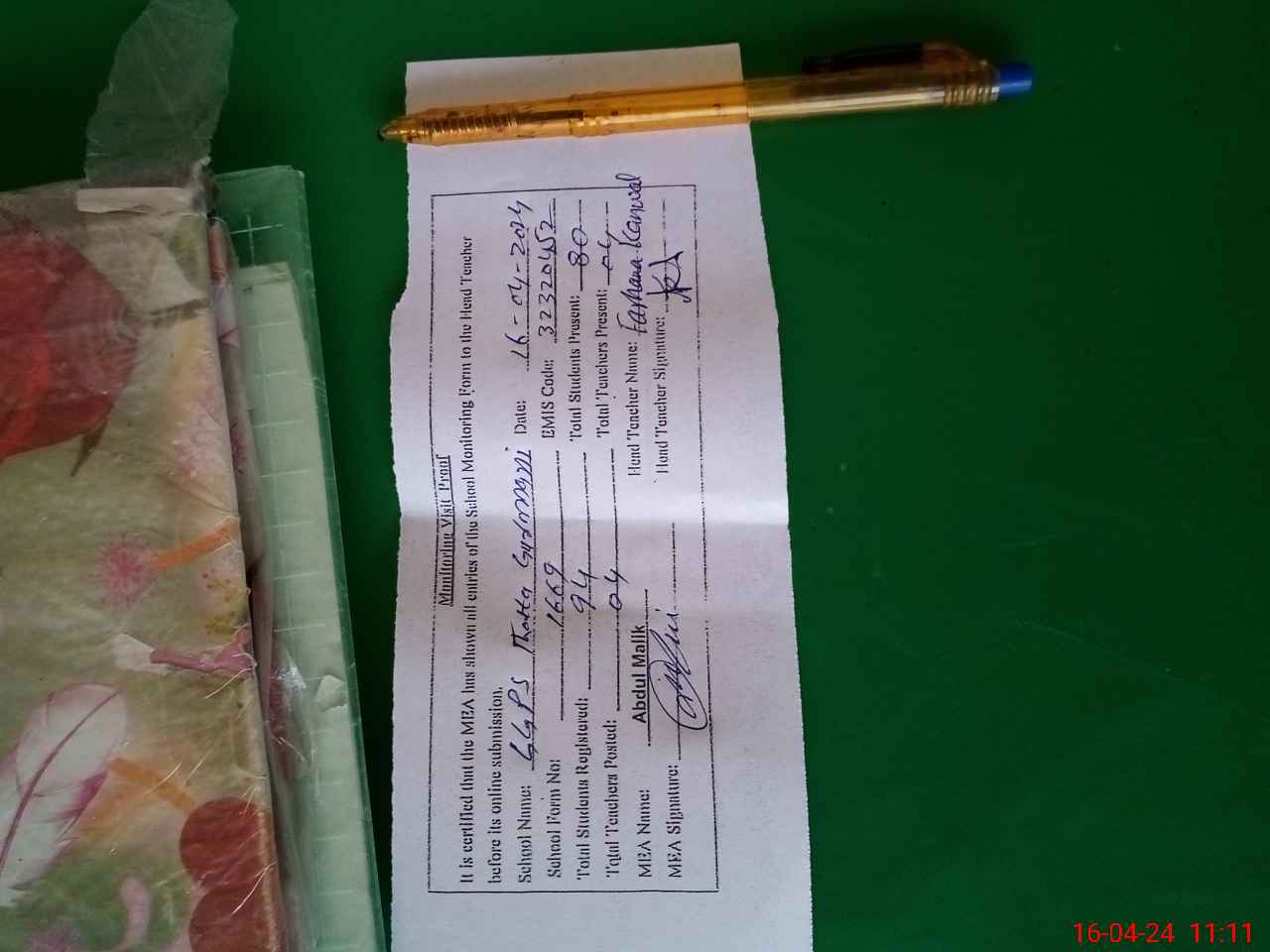 | Attendance Register | Head Teacher | MEA with School | Visit Proof |