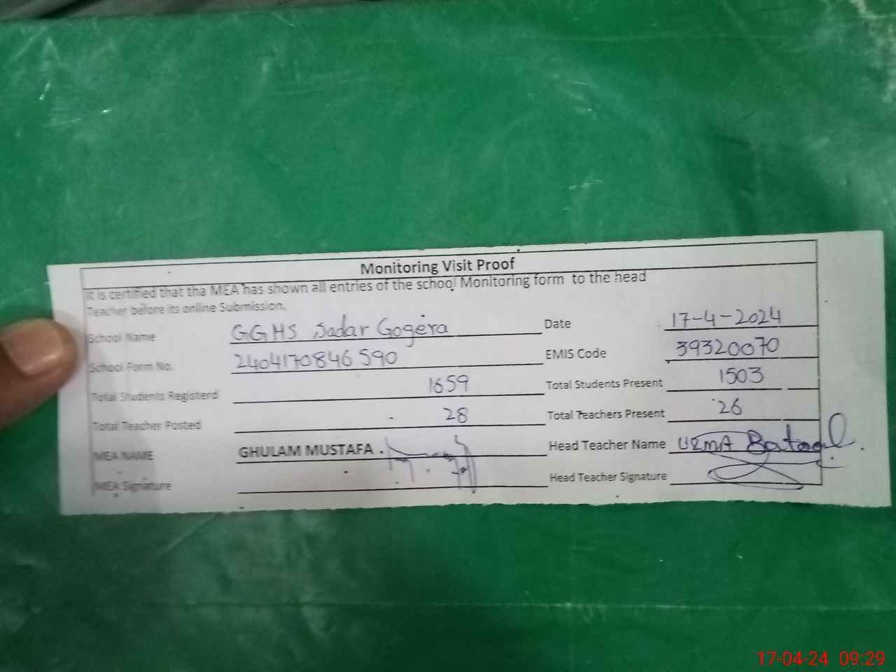 | EMIS Code: 39320070 | Name of School: GGHS SADAR GOGERA | |||