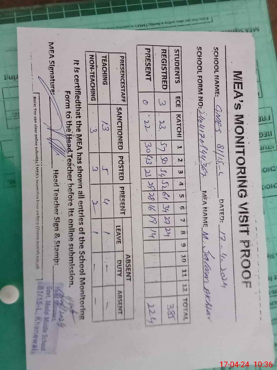 | Attendance Register | Head Teacher | MEA with School | Visit Proof |