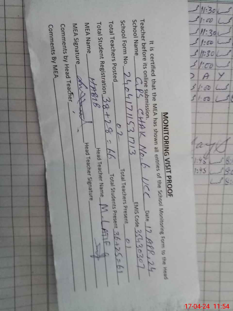 | Attendance Register | Head Teacher | MEA with School | Visit Proof |