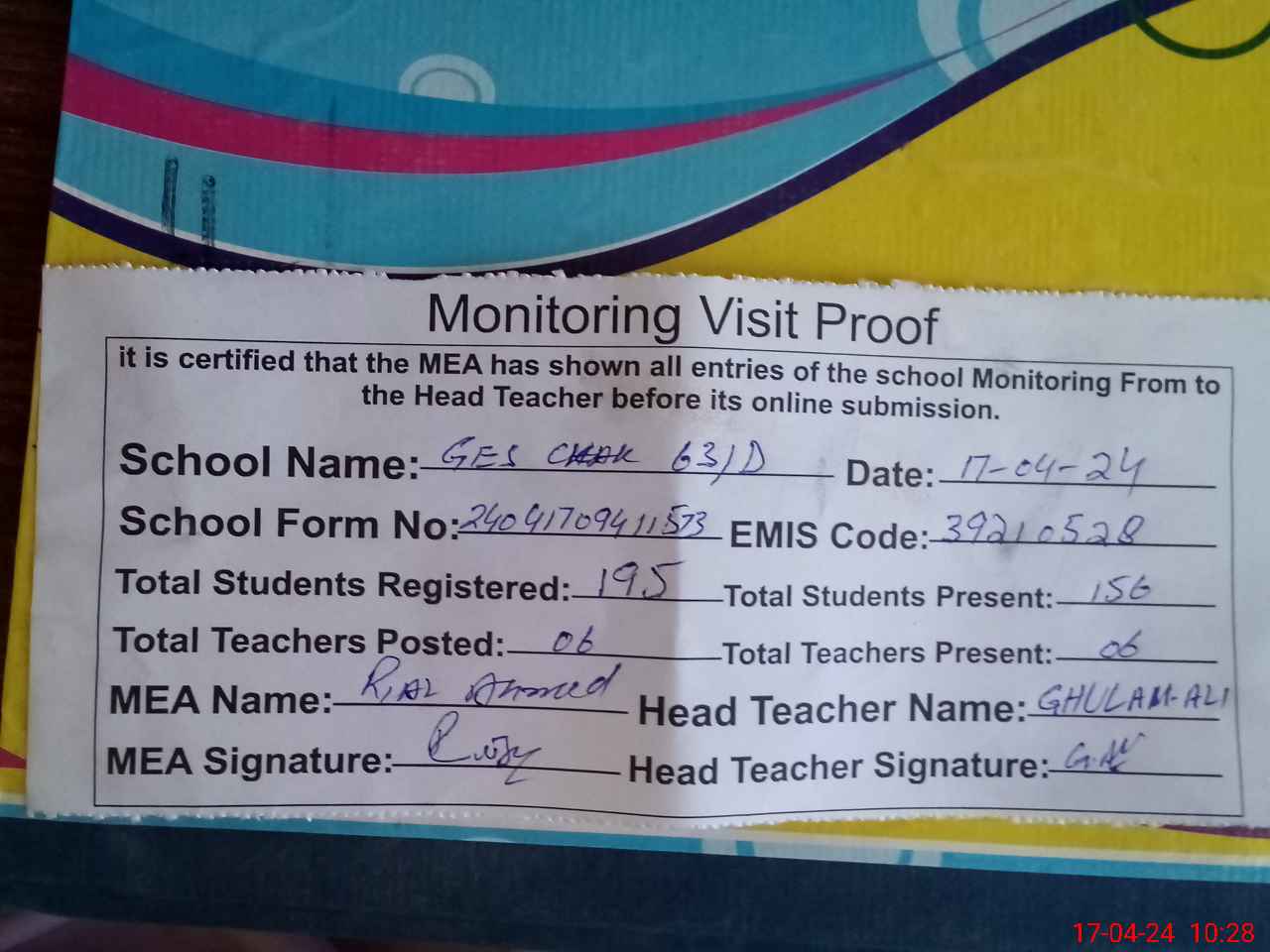 | EMIS Code: 39210528 | Name of School: GES CHAK NO. 63 D | |||