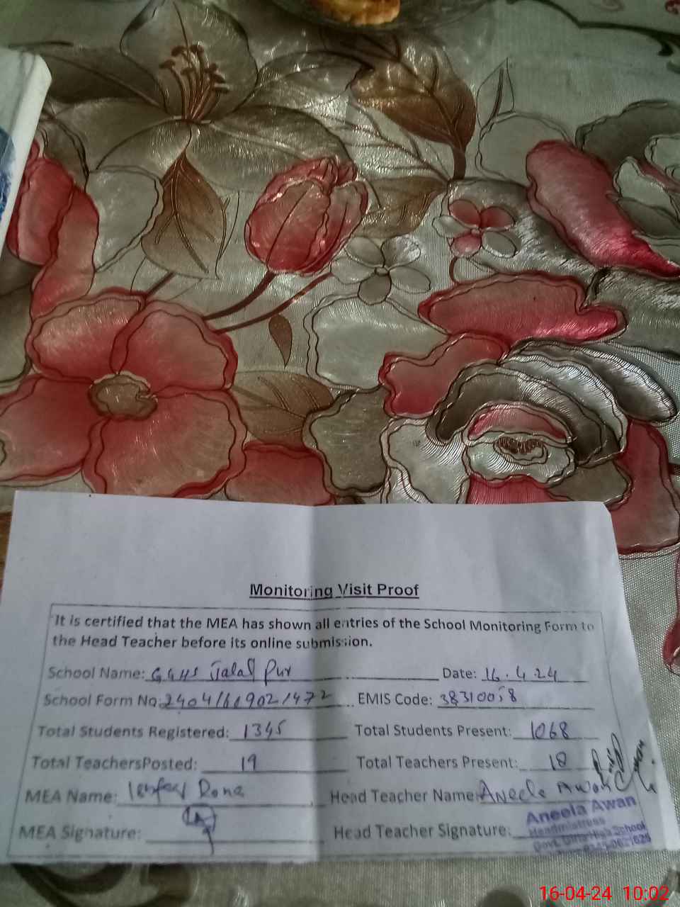 | Certified that this School was Inspected by the Undersigned MEA/DMO Today and the Information Stated Above is as Per Record. | |||||