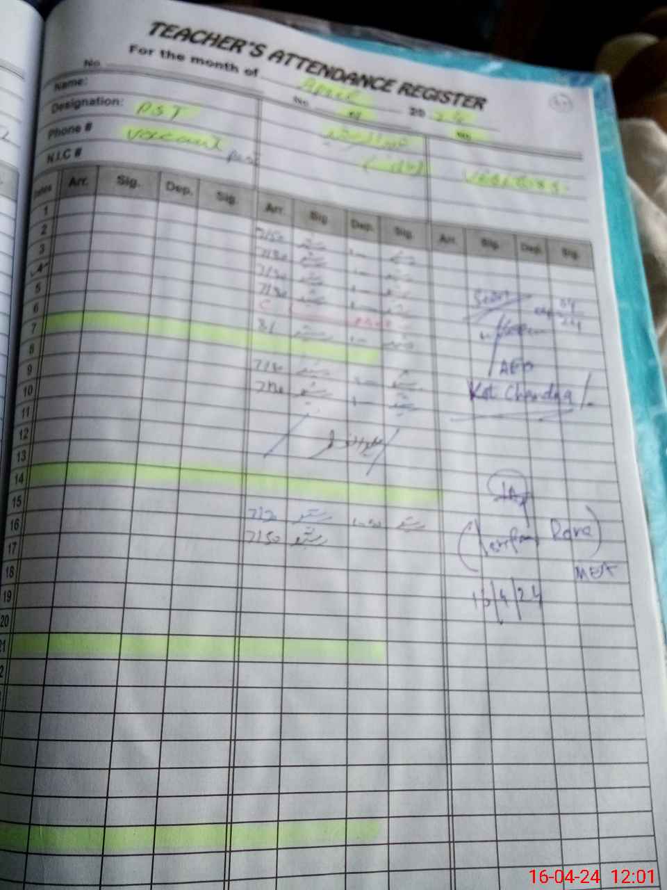 | CNIC | Full Name | Designation | R/C | Absence During Last Calender Month |