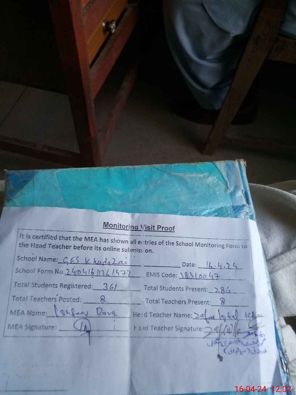 | Attendance Register | Head Teacher | MEA with School | Visit Proof |