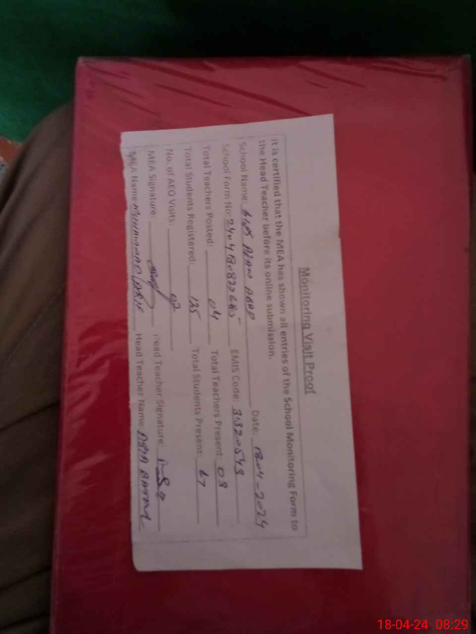 | Attendance Register | Head Teacher | MEA with School | Visit Proof |