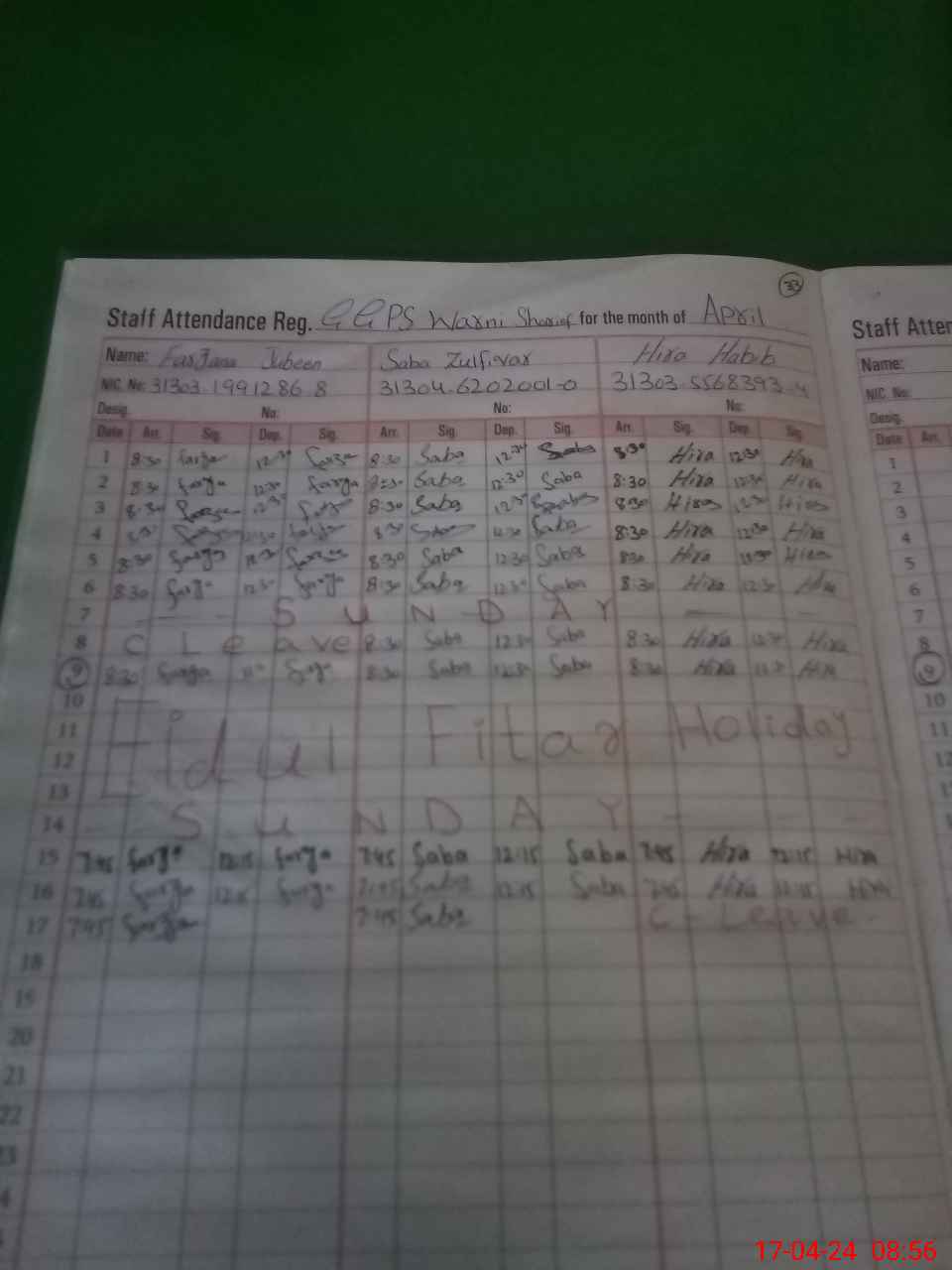 | CNIC | Full Name | Designation | R/C | Absence During Last Calender Month |