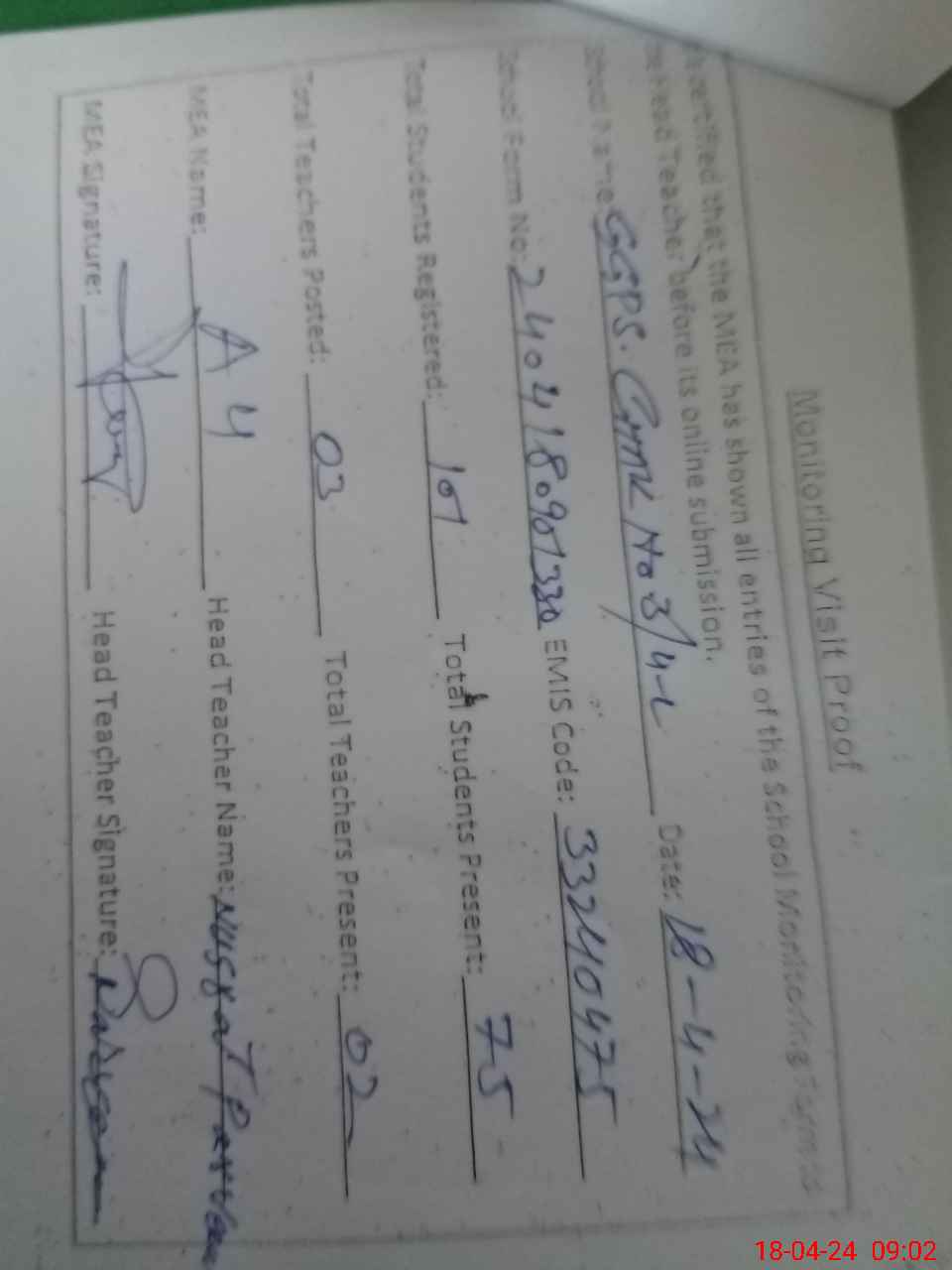 | EMIS Code: 33240475 | Name of School: GGPS CHAK NO 3/4L FAIZ ABAD | |||