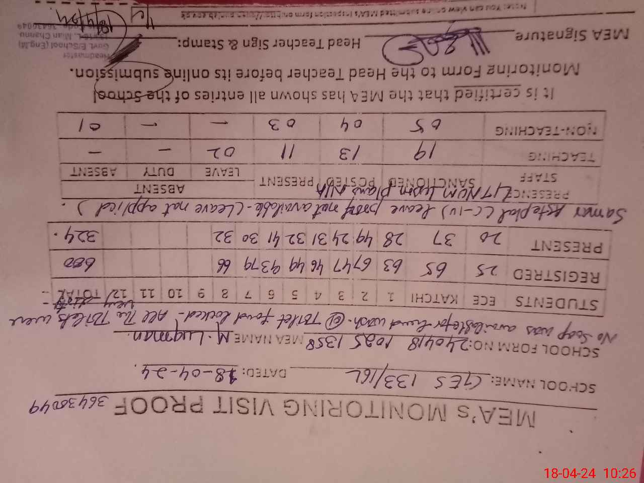 | Attendance Register | Head Teacher | MEA with School | Visit Proof |