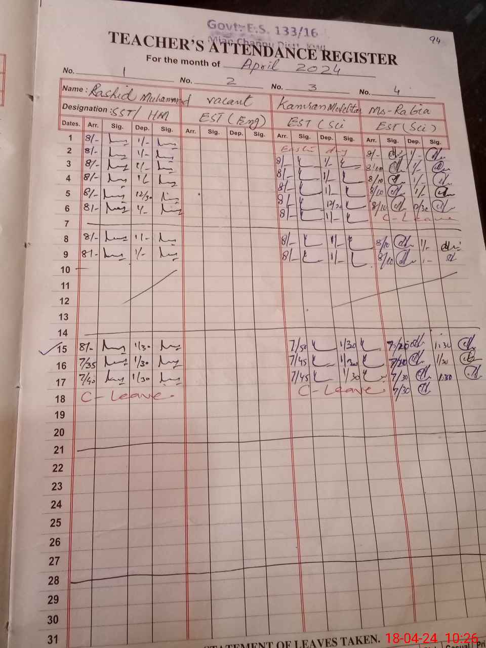 | CNIC | Full Name | Designation | R/C | Absence During Last Calender Month |