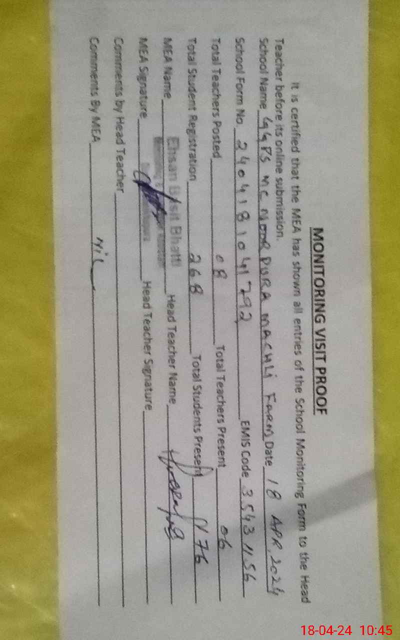 | EMIS Code: 35431156 | Name of School: GGPS MC NOOR PURA MACHLI FARM | |||