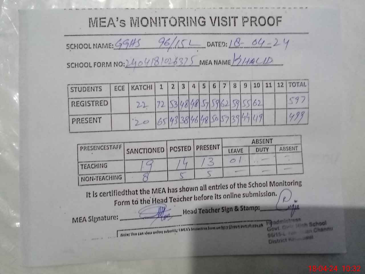 | Attendance Register | Head Teacher | MEA with School | Visit Proof |