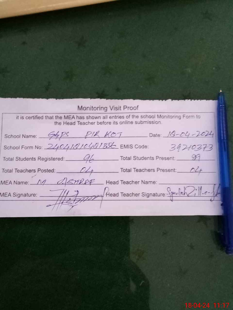 | Attendance Register | Head Teacher | MEA with School | Visit Proof |