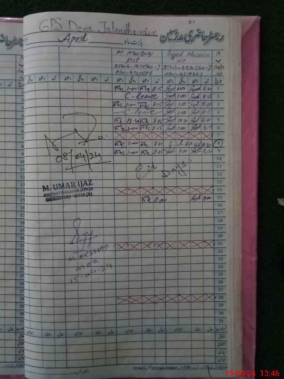 | CNIC | Full Name | Designation | R/C | Absence During Last Calender Month |