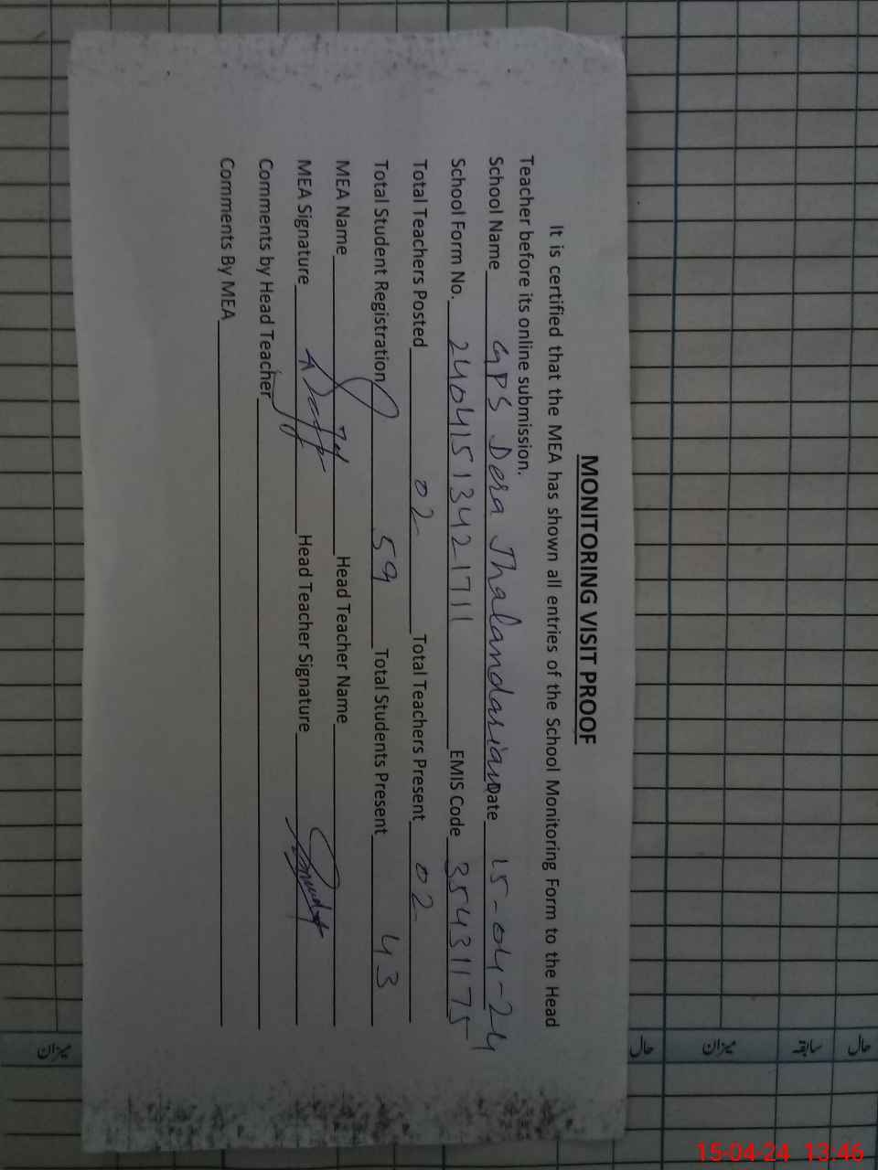 | Attendance Register | Head Teacher | MEA with School | Visit Proof |