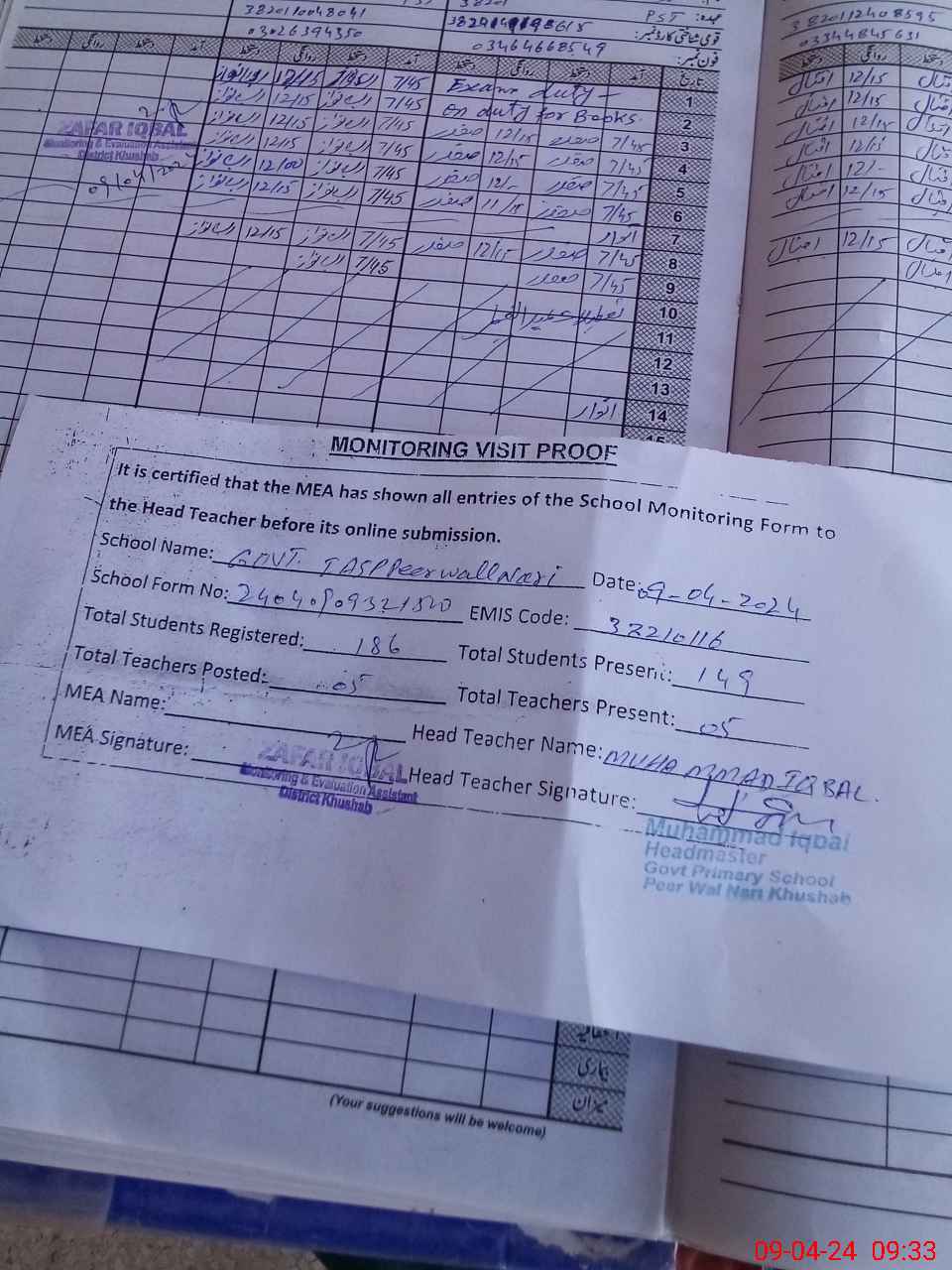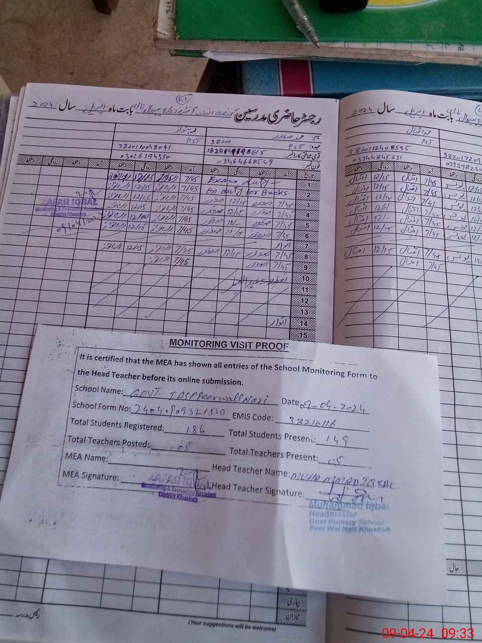 | Attendance Register | Head Teacher | MEA with School | Visit Proof |