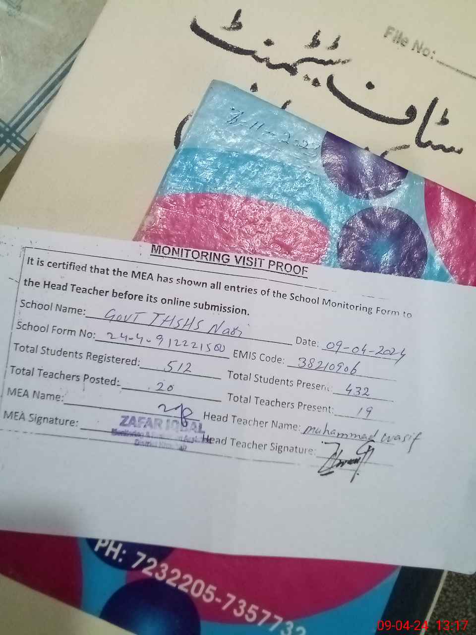 | Attendance Register | Head Teacher | MEA with School | Visit Proof |