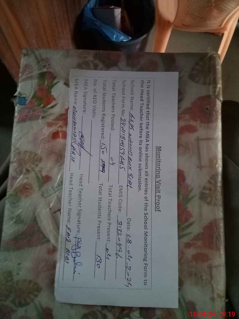 | Attendance Register | Head Teacher | MEA with School | Visit Proof |