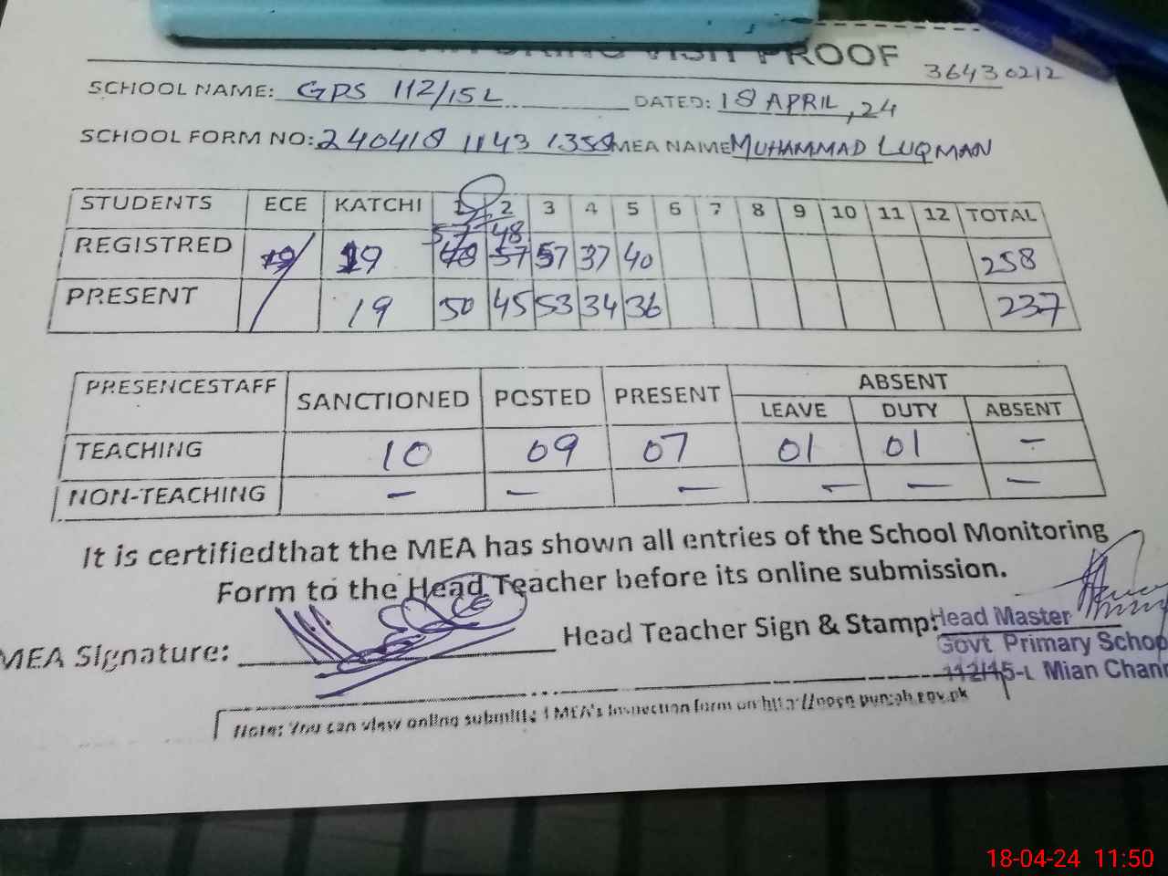| Attendance Register | Head Teacher | MEA with School | Visit Proof |