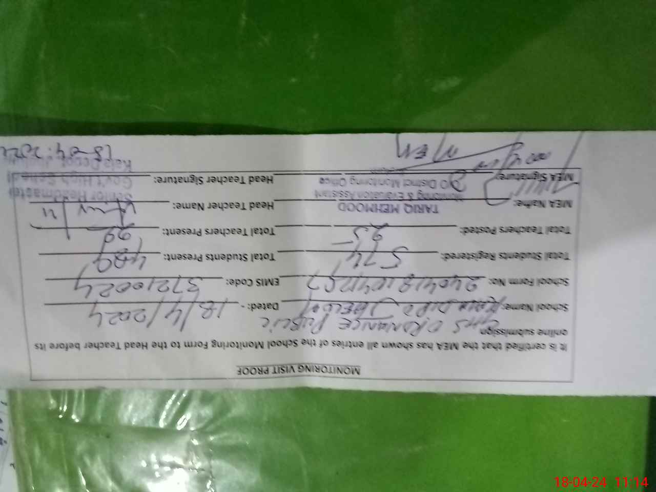| Attendance Register | Head Teacher | MEA with School | Visit Proof |