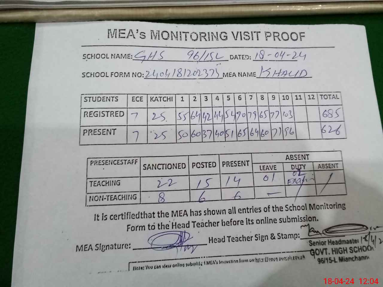 | EMIS Code: 36430026 | Name of School: GHS 96/15-L, MIAN CHANNU | |||