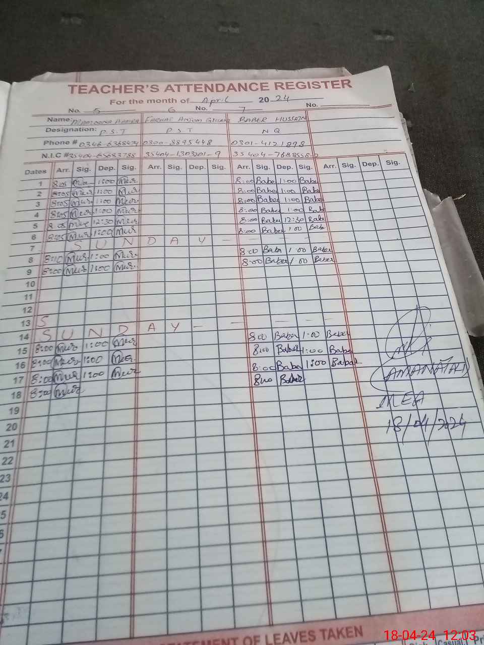 | Name: TA**** KH**** Designation: (School Headmaster's/Headmistress's) PST Phone/Cell Number: 03**** |